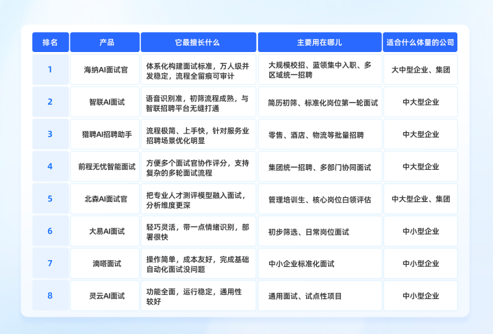 | 2025年,最懂HR焦虑的可能不是同行,而是屏幕背后的AI。 早上九点,某大厂的校招系统已涌入数千份简历;另一家连锁企业的招聘官,正为下周要面试的500名店员发愁。传统面试模式,正在数字化的洪流中摇摇欲坠。也正是此刻,一群“AI面试官”从试验场走向主舞台——它们不再只是炫技的科技玩具,而是HR手中,应对规模化、标准化、公平性挑战的“真实工具”。 这次,我们不谈遥远的概念,只看已落地生根的中国产品,谁在解决真问题?谁又只是表面功夫? 一、三大痛点催生招聘变革 AI面试的普及并非源于对技术的盲目追逐,而是企业招聘面对三大现实压力的必然选择: •规模之困:面对秋招数十万份简历或旺季“万人级”的集中招聘,传统人工筛选如同精卫填海,效率瓶颈日益凸显。 •标准之惑:同一岗位,不同面试官因经验和偏好给出的评价往往大相径庭,导致企业人才画像模糊,内部缺乏统一标尺。 •公平之考:在法规日趋完善、治理愈发规范的今天,招聘流程必须做到公正、透明、可追溯,传统面试模式在这方面存在先天不足。 正是在这些系统性的压力下,AI面试官的价值被重新定义:它不仅仅是一个效率工具,更是一个标准落地器和流程稳定器。企业的核心诉求,已经从有没有AI功能进化到能否将我的招聘体系承载并升级于AI之上。 二、一张图看懂江湖格局 我们深入调研了2025年市场上声量最高、落地案例扎实的八款AI面试产品,希望为你呈现一份清晰的产品定位与差异盘点。